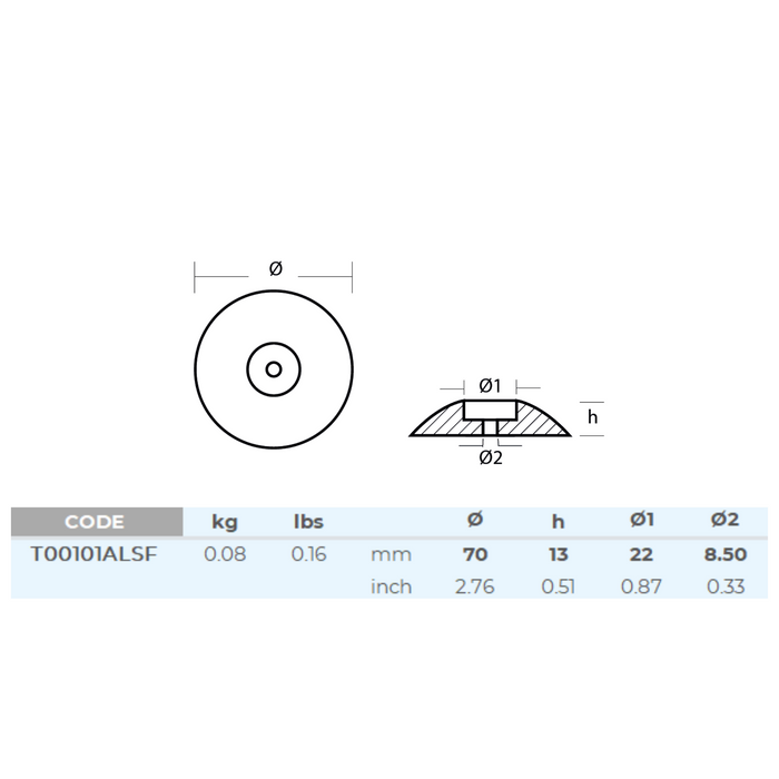 Aluminum anode rudder - Ø = 70mm, 0.08KG/ 2.75inch, 0.176Lb