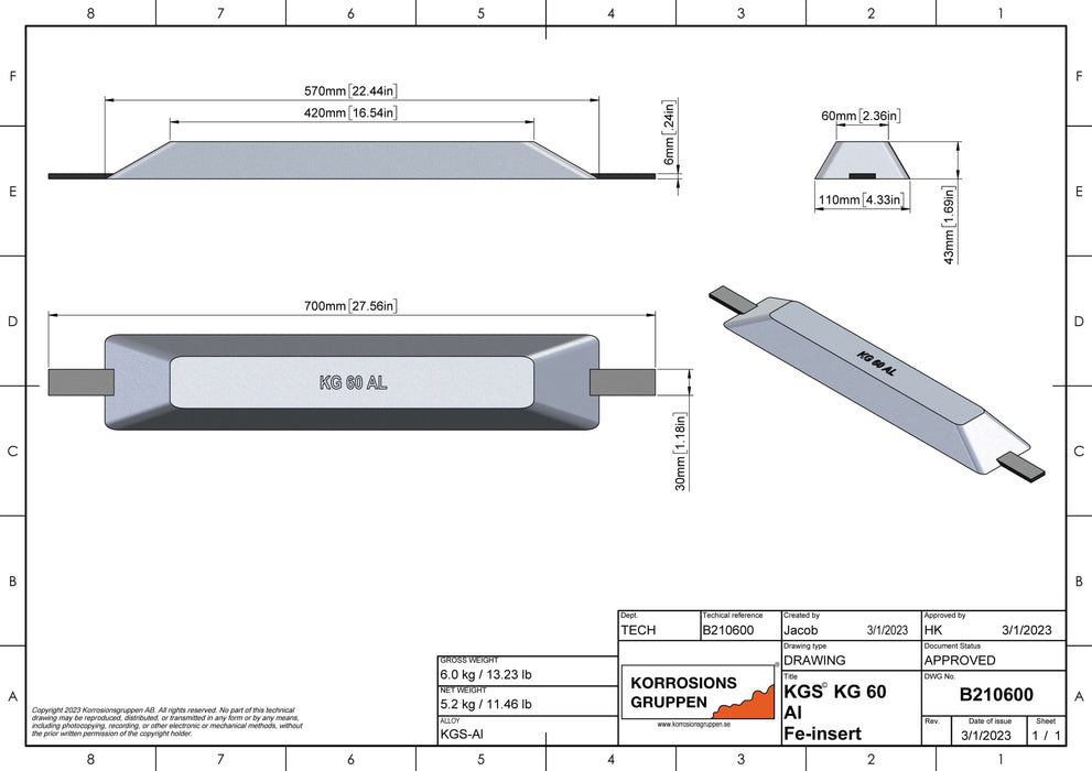 6.0 KG/13.22 LB aluminum anode for ships holes