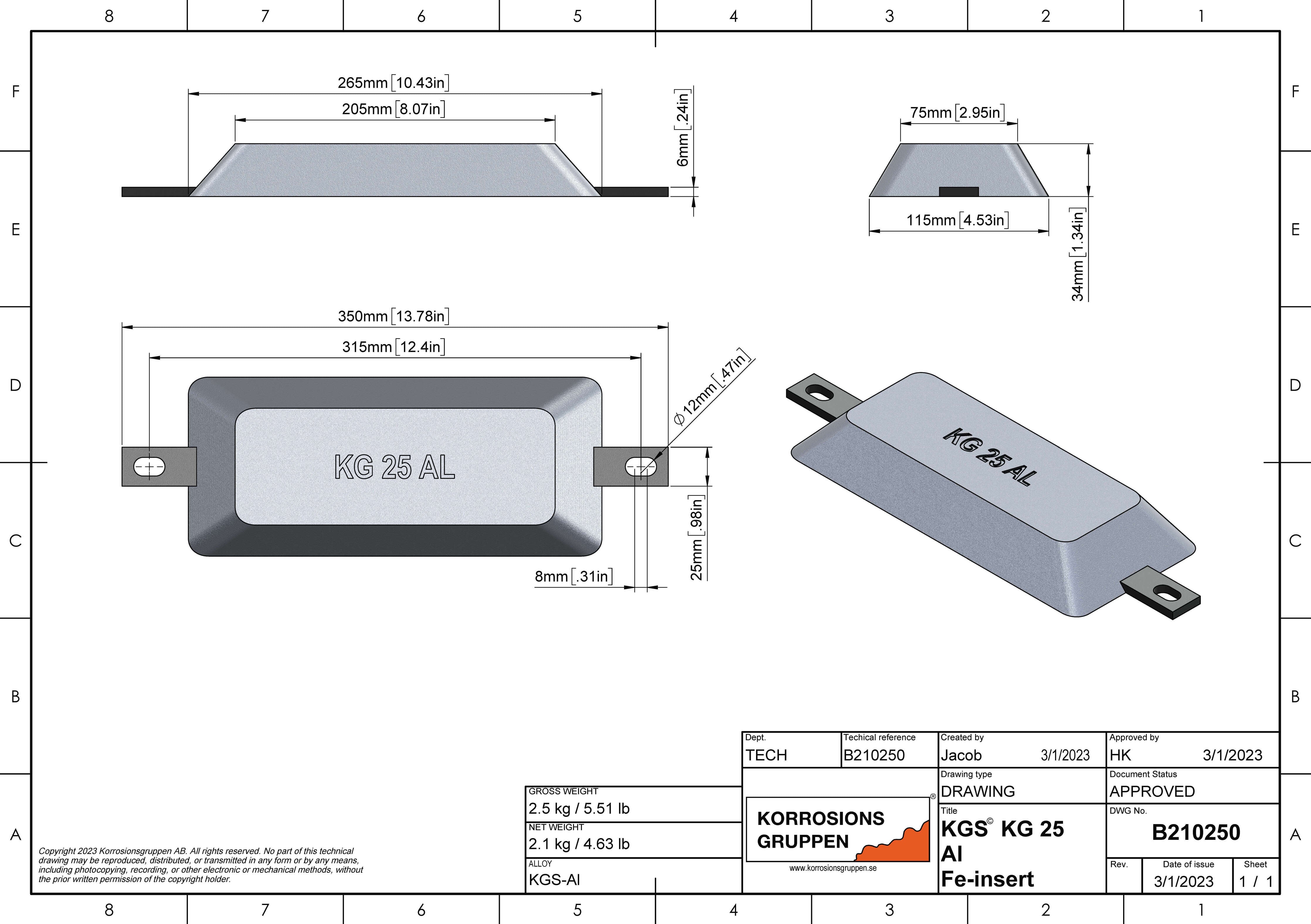 Aluminium anode TYPE 25 - 265*115*34mm/ 10,43*4,53*1,34in