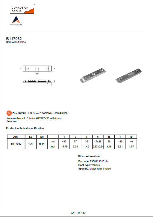 Zinkanod KGS © Kamewa/Rolls Royce RRM000260003A 400x75x30 mm, 4,9 kg 117062