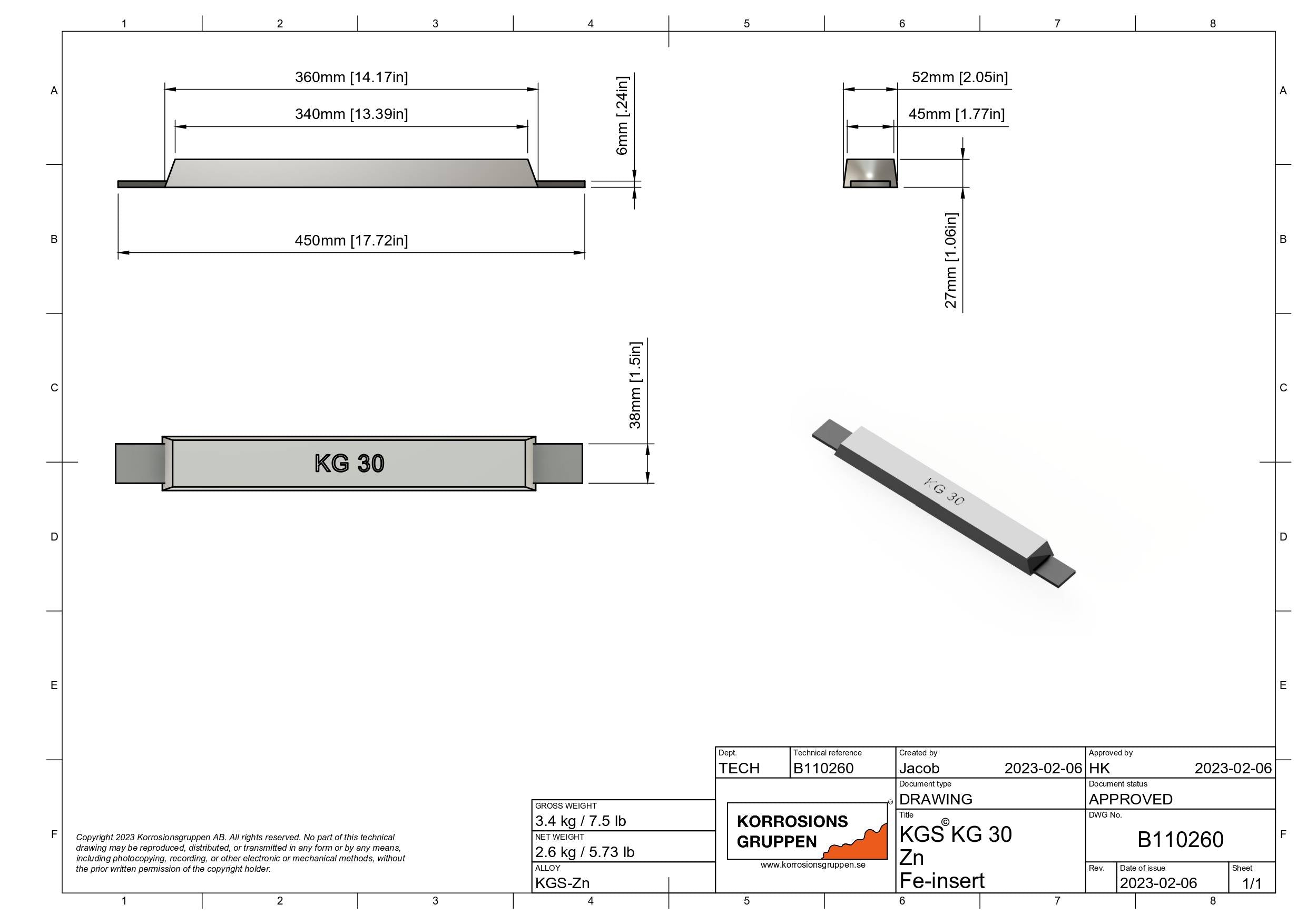 Zinkanod TYP 30 - 360*52*27mm / 14*2*1.06in, Armering: Stål, 450*40*6mm / 17.8*1.6*0.23in, 2.6kg netto